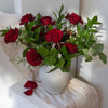 Our Valentine's Day Fleur du Jour or "flowers of the day," include a dozen stems of the Hearts Garden Roses, lush stems of greenery, and sprigs of textural accent flowers. This Full Dozen rose bouquet is available with or without our Verdure No. 3 Vase.